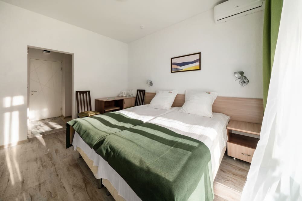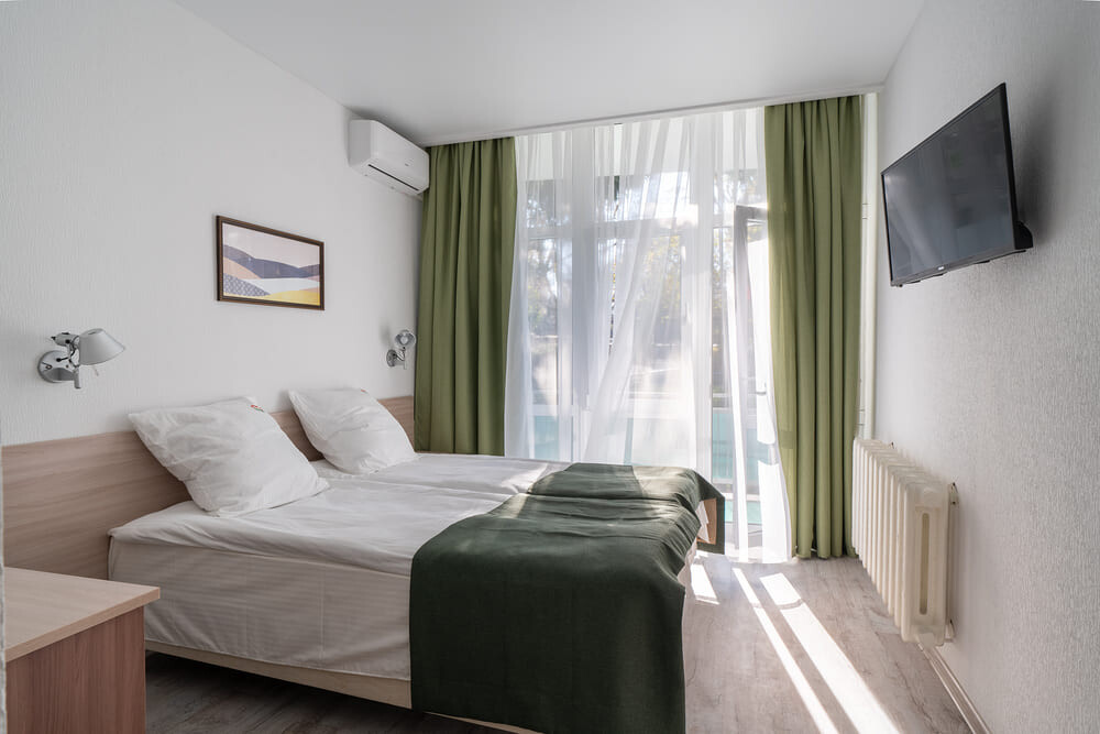 Площадь номера - 18 кв.м. 1 комната. 2 осн. места. В номере: телевизор; холодильник; кондиционер; душ; фен; 1-спальные кровати; санузел. 2 доп. места: Еврораскладушка - Предоставляется только для детей до 14 лет.